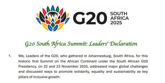 当地时间11月22日,二十国集团领导人第二十次峰会在南非约翰内斯堡开幕。南非国际关系与合作部长罗纳德·拉莫拉在下午举行的新闻发布会上表示,与会各方就会议主要议程达成共识,通过了《二十国集团领导人约翰内斯堡峰会宣言》。